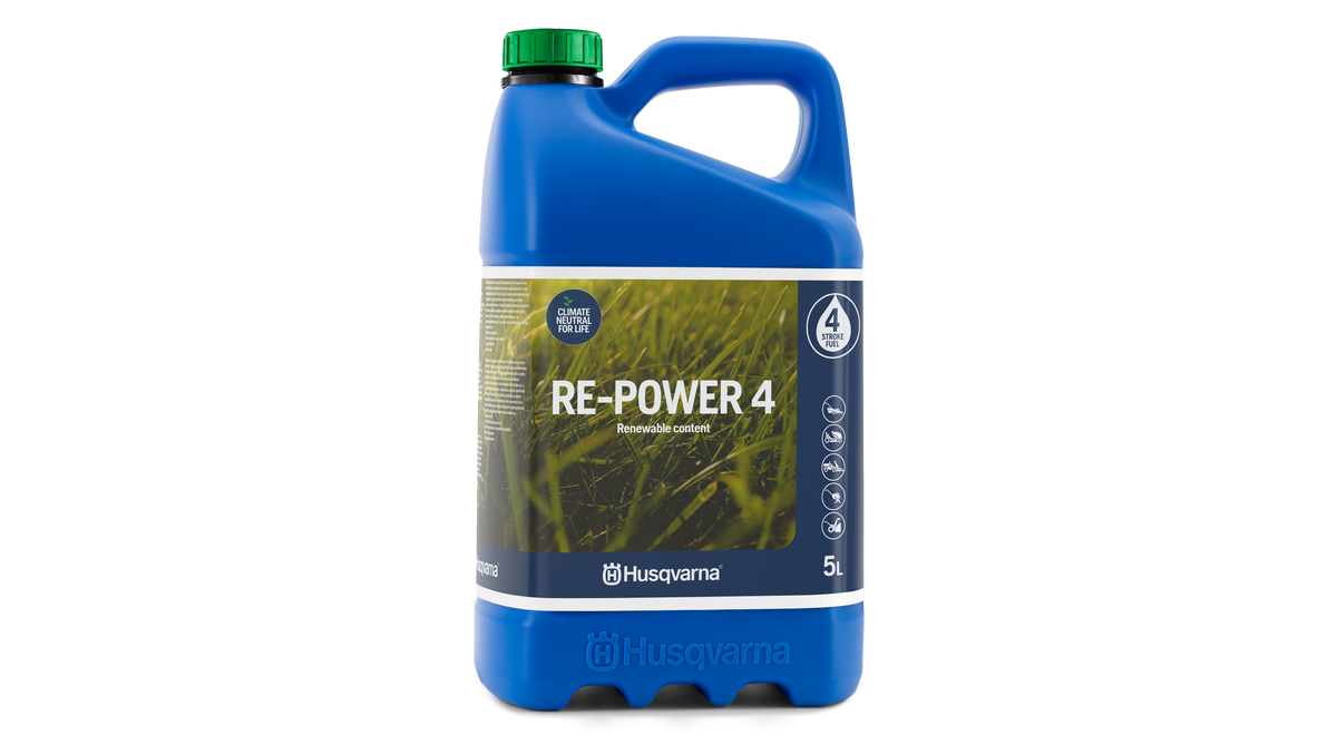 Husqvarna Re-Power 4 är en alkylatbensin optimerad för mindre 4-taktsmotorer. Re-Power 4 ger en renare förbränning inuti motorn, vilket ger en längre produktlivslängd och ett minskat servicebehov. Re-Power 4 med förnybart innehåll minskar mängden skadliga utsläpp jämfört med vanlig bensin, vilket minskar dess klimateffekt och förbättrar din arbetsmiljö.