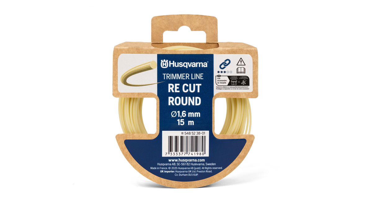 Husqvarna RE Cut trimmerlina är gjord av Ultramid® B LowPCF-material*. Den ger samma hållbarhet och skärprestanda som traditionella trimmerlinor och tack vare sin runda form är den lätt att hantera. Passar alla vanliga trimmerhuvuden. – – *Läs mer om Ultramid® B LowPCF-material på BASFs hemsida.